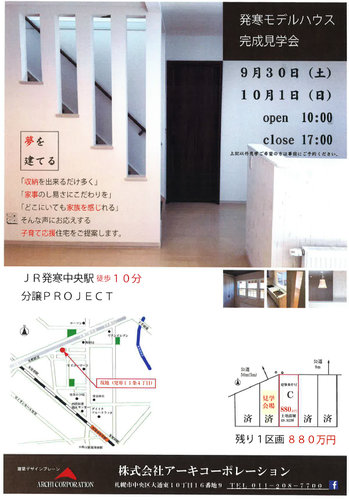 【発寒11-4 分譲地内】9/30(土)・10/1(日) モデルハウス完成見学会開催!