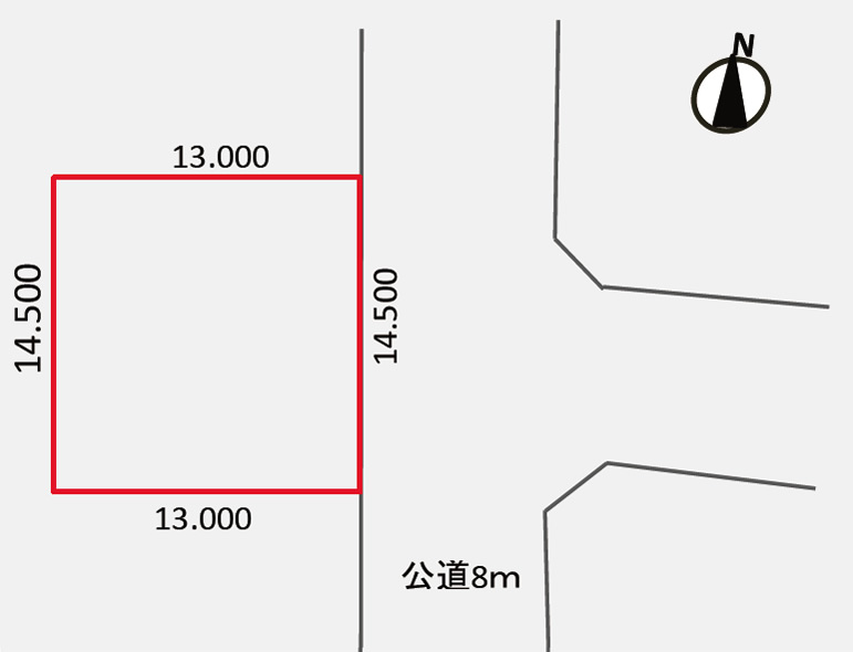 | 接道状況 | 北西側公道8m、及び南西側公道8m |
